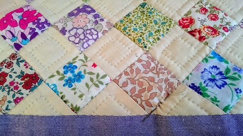 素晴らしい作品を見てすっかり楽しい気持ちになり、せっせと四角つなぎをキルティングしています。