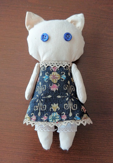 このネコちゃんのワンピースは、キルティングバッグを作った残りのハギレだったと思います。